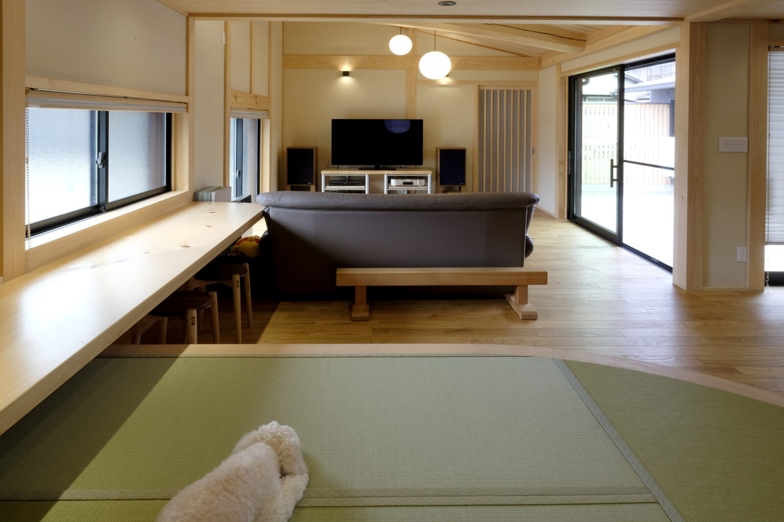 畳の小上がりは、腰掛けたり寝たり遊んだりと何かと重宝していて、あって良かったです。ただ、小さな子どもと犬がいるので、イグサの畳を選ばなくて正解だったなとは思います。