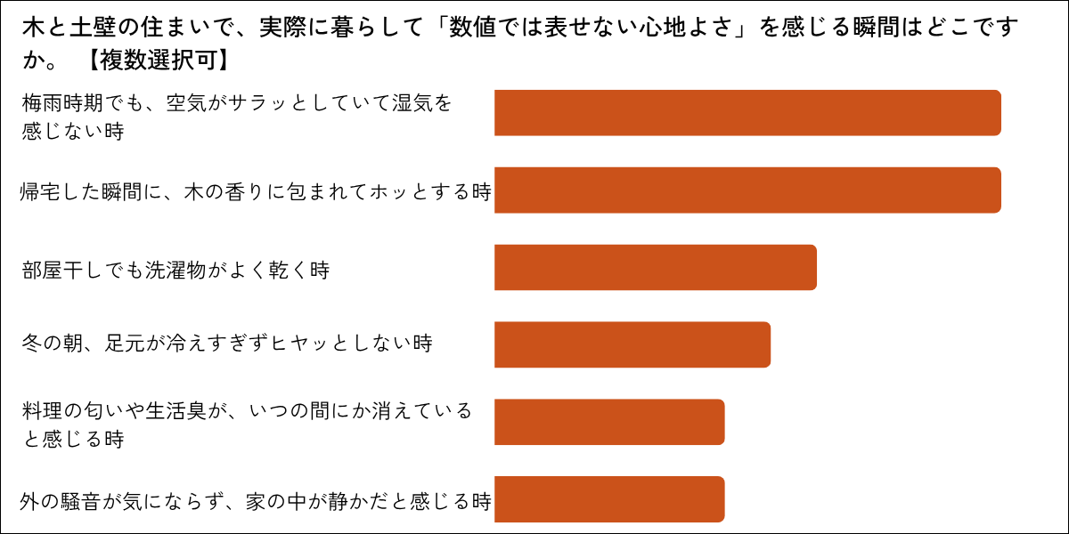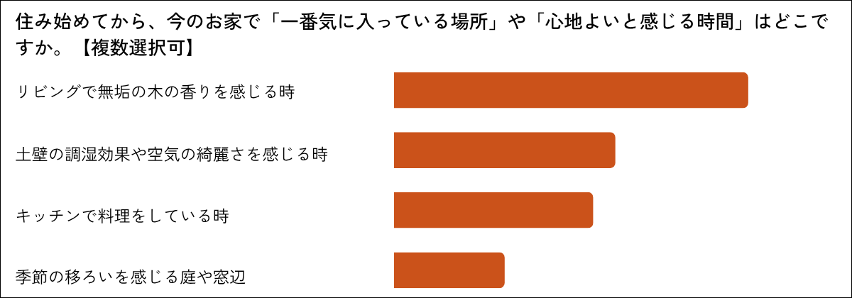 「梅雨時期でも、空気がサラッとしていて湿気を感じない時」と「帰宅した瞬間に、木の香りに包まれてホッとする時」が同率1位となりました。梅雨の蒸し暑さや冬の朝の冷たさなど、日本の気候で「ちょっとつらいな」と感じる瞬間に、この家はそっと応えてくれている。そんな声が集まりました。また、土壁が持つ調湿・蓄熱・消臭の力が、毎日の暮らしで息づいていることも分かります。